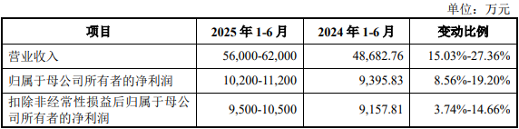 经初步统计测算,公司2025年1-6月营业收入为56,000万元至62,000万元,同比增长15.03%至27.36%;归属于母公司所有者的净利润10,200万元至11,200万元,同比增长8.56%至19.20%;扣除非经常性损益后归属于母公司所有者的净利润9,500万元至10,500万元,同比增长3.74%至14.66%。