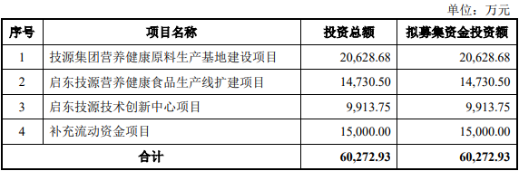 技源集团本次发行募集资金总额为54,410.88万元,扣除发行费用后,募集资金净额为47,981.82万元。技源集团最终募集资金净额较原计划少12,291.11万元。技源集团于2025年7月18日发布的招股说明书显示,公司拟募集资金60,272.93万元,分别用于技源集团营养健康原料生产基地建设项目、启东技源营养健康食品生产线扩建项目、启东技源技术创新中心项目、补充流动资金项目。