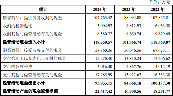 2022年、2023年、2024年,公司的营业收入分别为94,724.39万元、89,189.42万元、100,185.74万元;净利润分别为14,360.82万元、16,050.90万元、17,534.41万元;归属于母公司所有者的净利润分别为14,207.27万元、16,001.66万元、17,444.45万元;扣除非经常性损益后的归属于母公司股东的净利润分别为14,304.19万元、15,336.70万元、17,060.53万元。