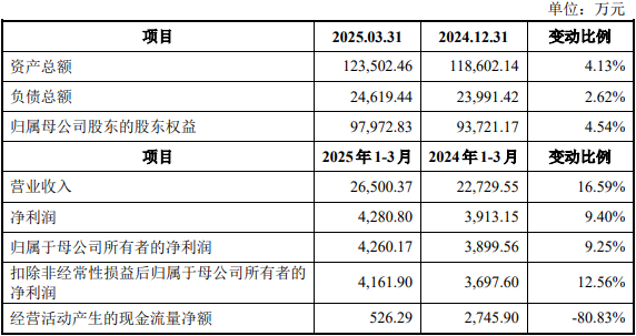 2025年1-3月,公司实现营业收入26,500.37万元,同比增长16.59%;净利润4,280.80万元,同比增长9.40%;归属于母公司所有者的净利润4,260.17万元,同比增长9.25%;扣除非经常性损益后归属于母公司所有者的净利润4,161.90万元,同比增长12.56%;经营活动产生的现金流量净额526.29万元,同比减少80.83%。